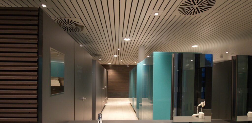 Aber auch Umkleideräume, Sanitärbereiche und Funktionsbereiche erfordern ein optimales Beleuchtungskonzept. Die Beleuchtung von Duschbereichen benötigt speziell an feuchte Umgebungen angepasste Lösungen sowie eine warmweiße Lichtfarbe von 3.000K, die zur Entspannung und zum Wohlbefinden beiträgt.